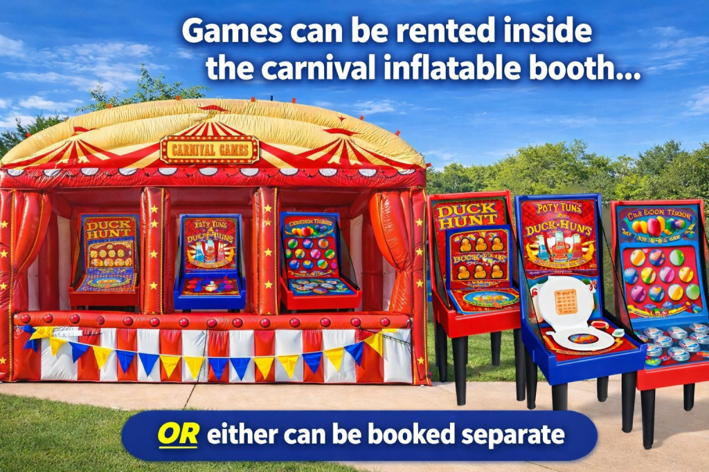The package includes Potty Toss, Can Smash, Fish in a Bowl, Balloon Pop, Duck Hunt, and Ring a Bottle — a lineup that blends classic carnival charm with the kind of friendly competition that gets everyone involved. Whether guests are lining up for a rematch or cheering on someone else, these games create the kind of atmosphere that makes an event memorable.